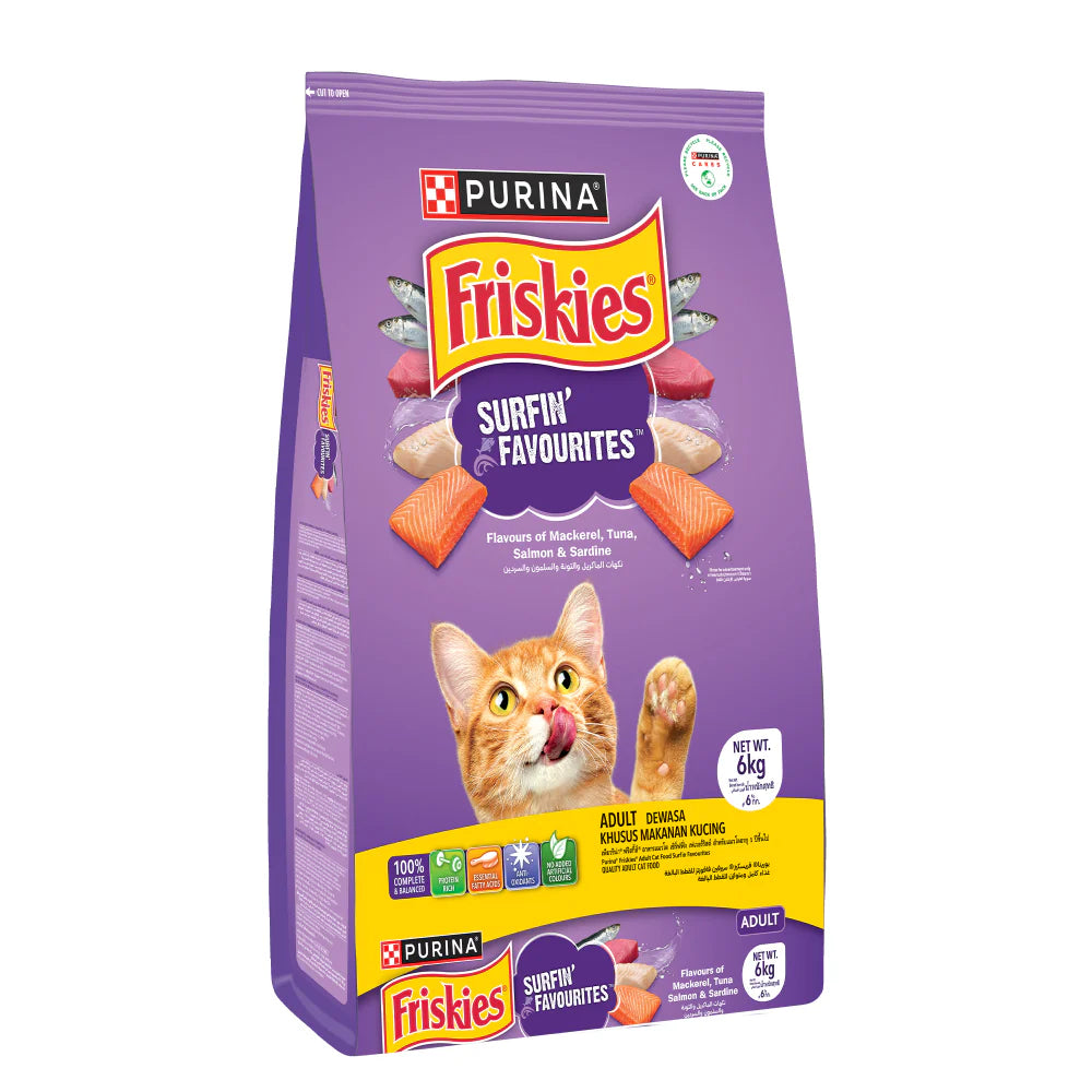 Treat your kitty to a nutritious blend from land and sea with Friskies Surfin' Favorites Dry Cat Food. This kibble features an irresistible mix of real chicken, ocean whitefish, salmon, and filet mignon in every crunchy bite, designed to satisfy even the most discerning feline palate. Friskies Surfin' Favorites offers complete and balanced nutrition, enriched with calcium and Vitamin D for strong bones and teeth, antioxidants to boost immune health, and taurine for clear vision, ensuring your furry friend purrs with delight at mealtime.