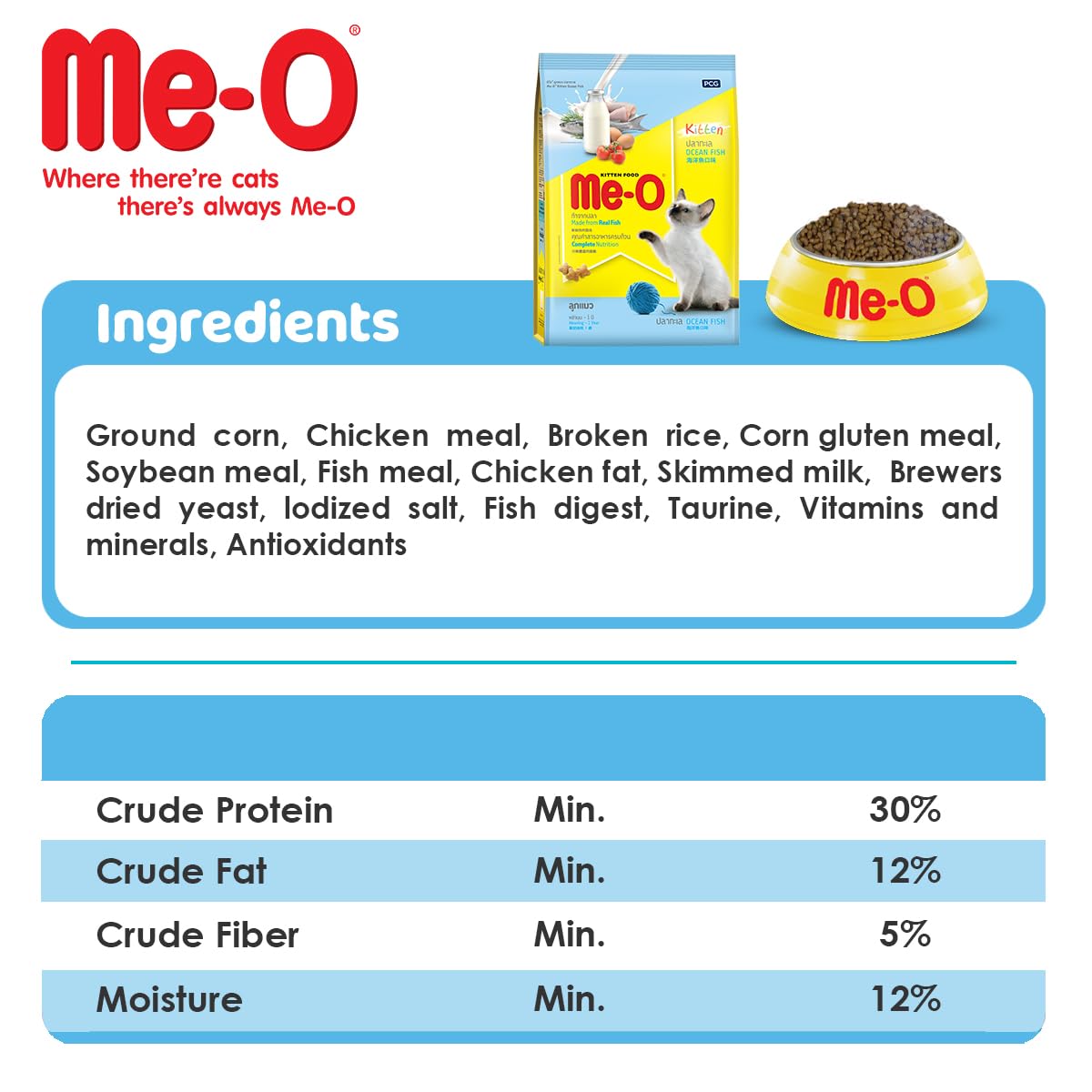 Me-O Ocean Fish Kitten Dry Cat Food is carefully crafted to nourish and support the growth and vitality of your kitten. This balanced diet features high-quality protein sourced from milk and ocean fish, promoting strong bones and teeth. Essential nutrients such as vitamin C contribute to a robust immune system, while reduced sodium levels maintain heart, kidney, and blood pressure health.